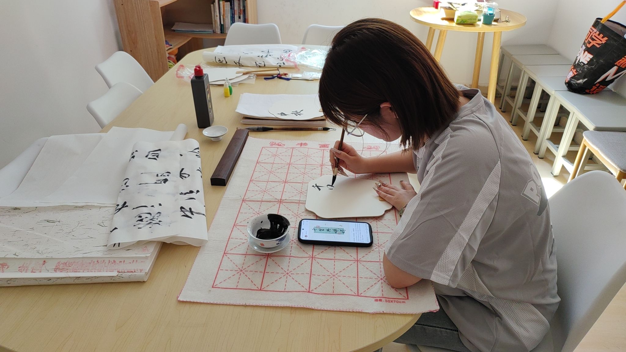 漆扇,作为中国传统文化的瑰宝,不仅具有实用价值,更是匠人智慧与情感的结晶。桌上铺满了各式各样的工具和材料:细腻的漆料、色彩斑斓的颜料、精致的扇骨以及各式各样的画笔和装饰物。学生们围坐在桌旁,脸上洋溢着好奇与兴奋。他们身穿便装,或低头沉思,或专注操作,每个人的眼神中都闪烁着对这项古老技艺的敬畏与热爱。阳光透过树叶的缝隙,洒在他们专注的脸上,为这场活动增添了几分温馨与宁静。