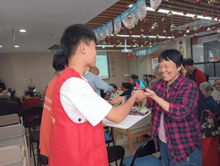 当活动接近尾声,学生们又迅速行动起来,进行场地撤收工作。他们动作麻利,将物品整理归位,使场地恢复整洁。此外,学生们还贴心地为老人们分发礼品,看到老人们脸上露出的喜悦笑容,他们也感受到了付出的价值。
