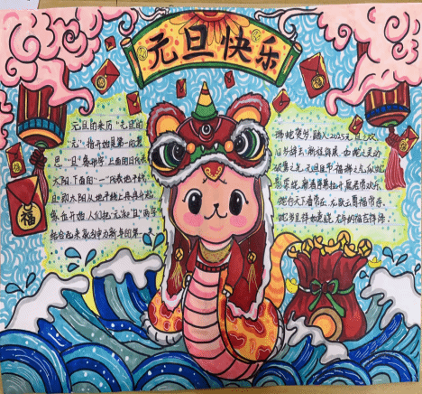 活动现场,同学们尽情发挥自身的想象力与创造力,挥动手中画笔、书写优美文字,描绘出蛇年的祥瑞与祝福,抒发对新年的美好憧憬与期待。手抄报内容丰富多彩,既有贴春联、吃年夜饭等传统春节习俗介绍,又有新颖别致的新年诗词、趣味小故事,每一幅作品都彰显出同学们对传统文化的深刻理解以及精湛的艺术造诣。